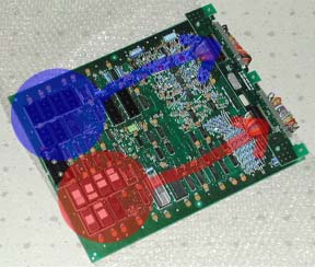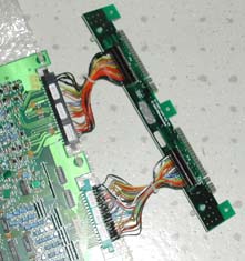 写真の赤い場所・青い場所にROMを差せまして、差したROMのゲームは、それぞれの矢印の場所のサブボード側のコネクターから各信号が出力されています。