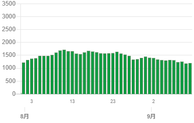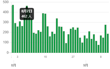 今月も、東京の感染者推移を見てみましょう。今回もとても簡単ではありますが、これだけは見ておく必要のある数字を確認しておきましょう。出典はすべて、東京都のコロナウィルス感染症対策サイトです。グラフは8月からのみ掲載します。掲載にあたり、グラフの数字がわかりやすいように編集しています。