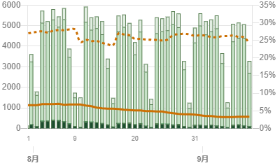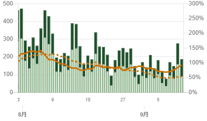 ここで重要なことは、新規患者が減少しているにも関わらず、PCR検査数は5000件前後をキープしていることです。このことから、単純に新規患者が減少していると言えます。当然、陽性率も減少します。7月の陽性率(オレンジ実線)が6%程度だったのが、4%台に減少しています。